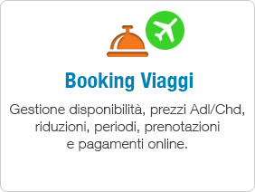 Gestione completa delle prenotazioni per ogni Viaggio/Offerta presente sul Sito/Portale. Gestione della disponibilità in base ai periodi inseiriti. Gestione periodi, prezzi, extra, costi fissi (voli, transfer, ecc..), riduzioni Adl/Chd, sconti e codici coupon. Prenotazioni e pagamenti online, gestione acconti. Motore di ricerca per data IN/OUT e numero persone adulti/bambini/infant completamente personalizzabile.